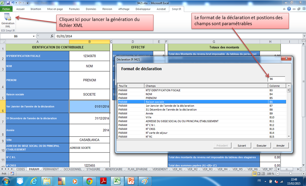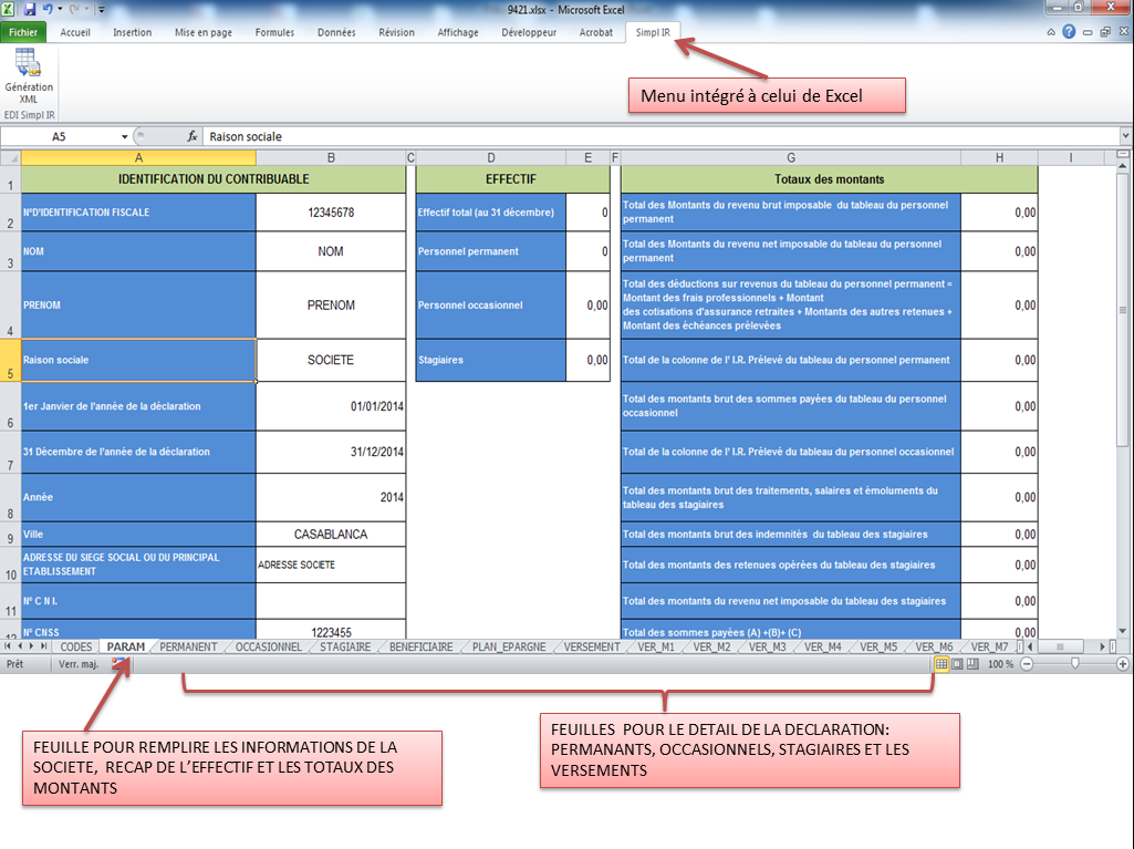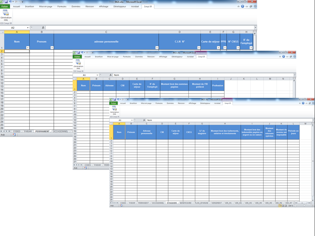 Ce complément intégré à Excel vous donne la possibilité de générer le fichier XML pour lé télé déclaration SIMPL IR de l'état 9421.